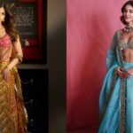 If anyone knows how to make a statement with colour, it’s Ananya Panday. The actress added a refreshing touch to the festive glam in a stunning turquoise and beige lehenga by designer Arpita Mehta. Her look featured intricate mirror cutdana and multi-thread embroidery over a Banarasi base, paired with a plunging bralette blouse that gave the traditional silhouette a modern spin. A soft organza dupatta with butti and tassel detailing completed the ensemble with elegance.